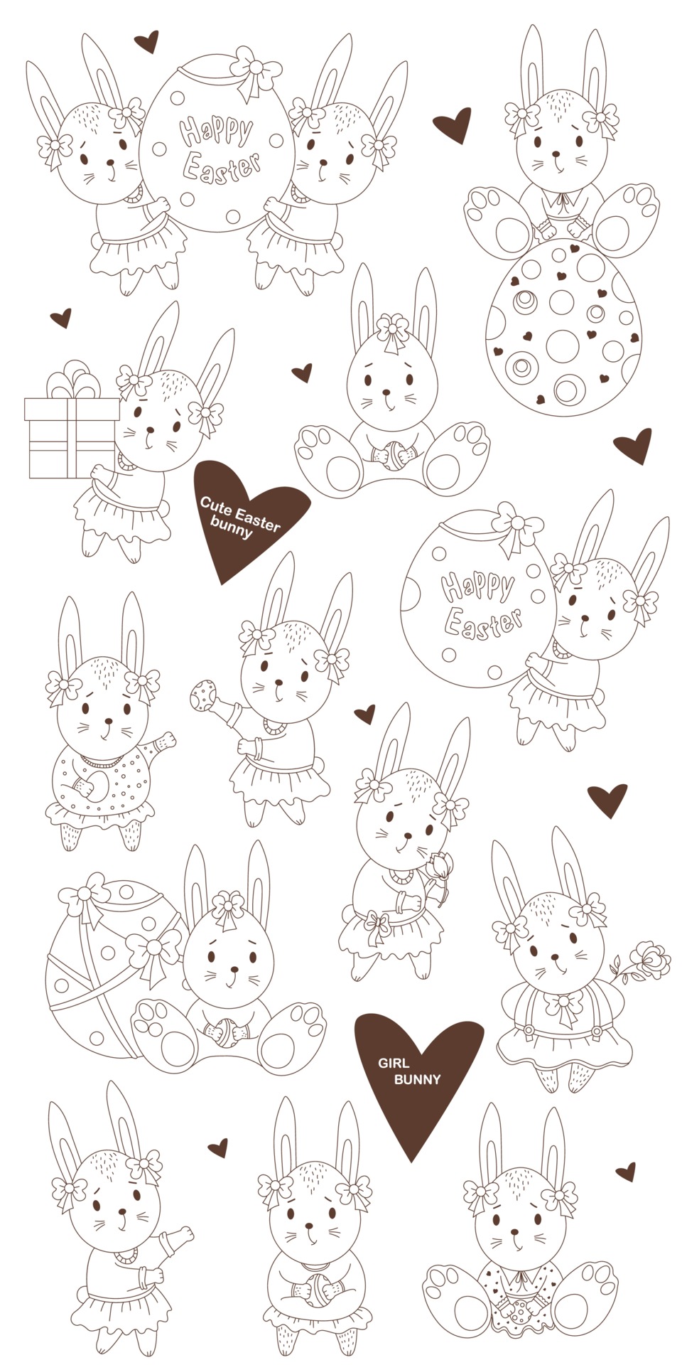Set Of Sketched Easter With Cute Bunnies Girls With A Gift With An Easter Egg With Flowers In Dress And With A Bow Vector Illustration Line Outline Decorative Drawings For Design